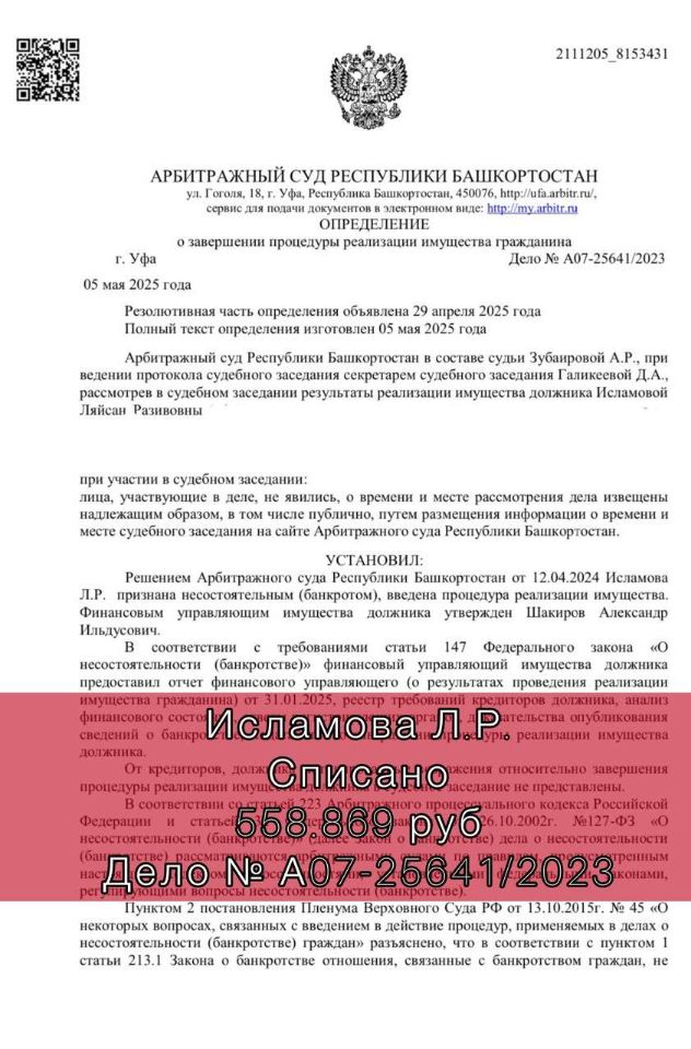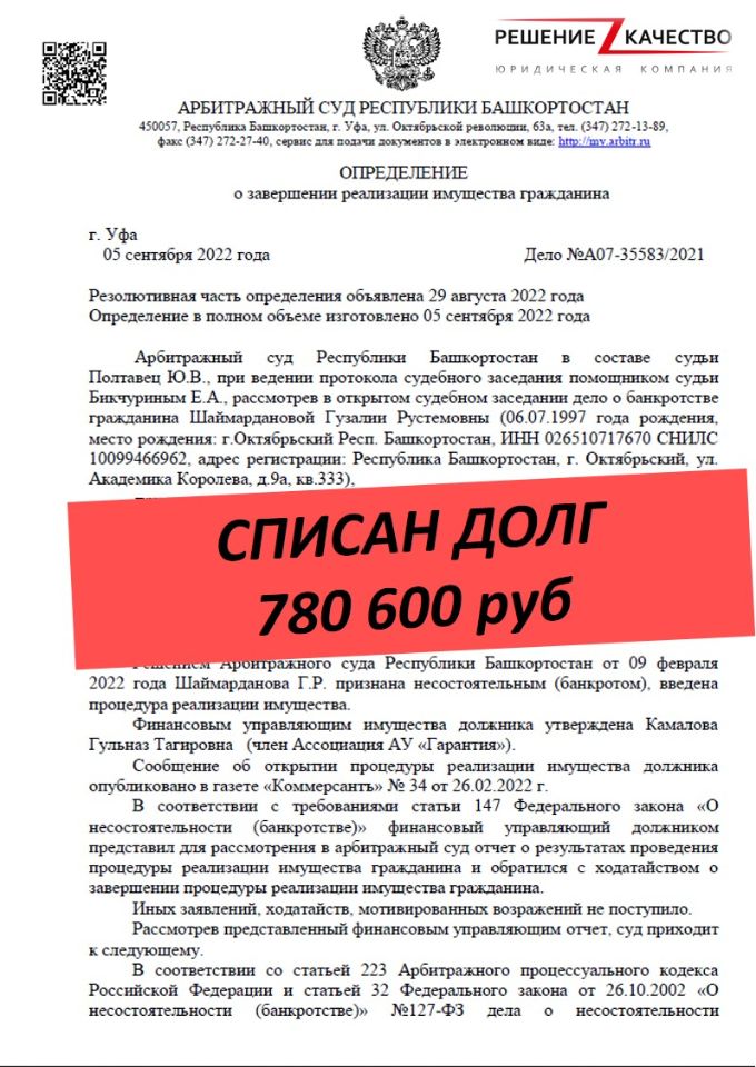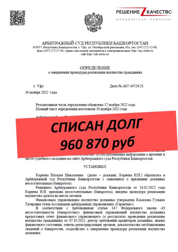 По завершению процедуры реализации имущества Вы получаете определение Арбитражного суда, которое подтверждает, что Вы освобождены от всех долгов. Определение суда вступает в силу немедленно и подлежит исполнению всеми государственными органами, банками, МФО и т.д. С этого момента Вы считаетесь освобожденными от всех долгов